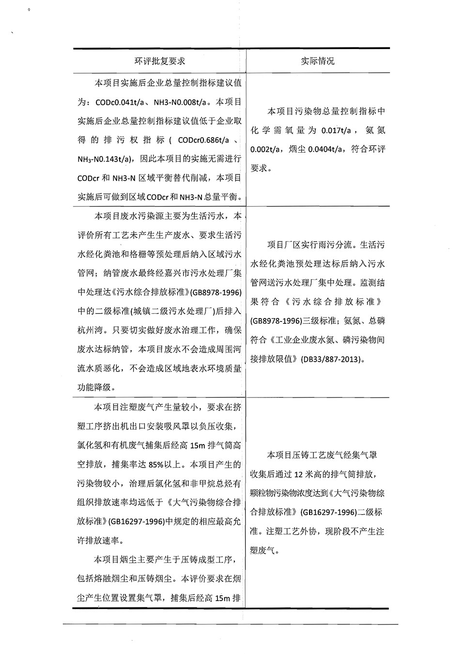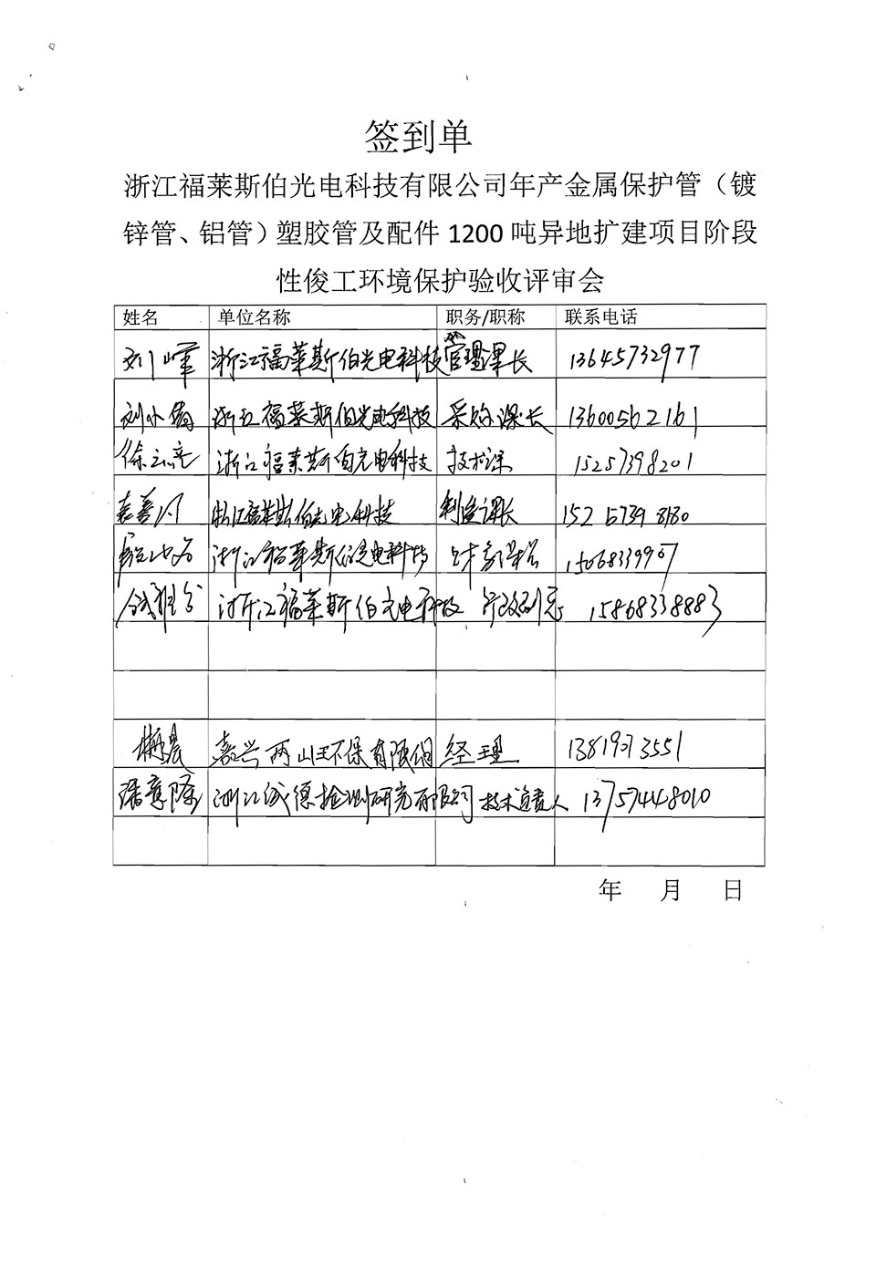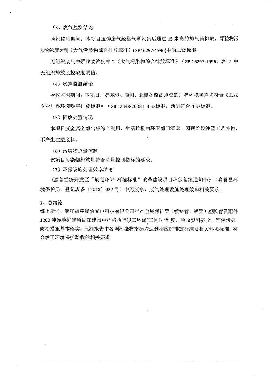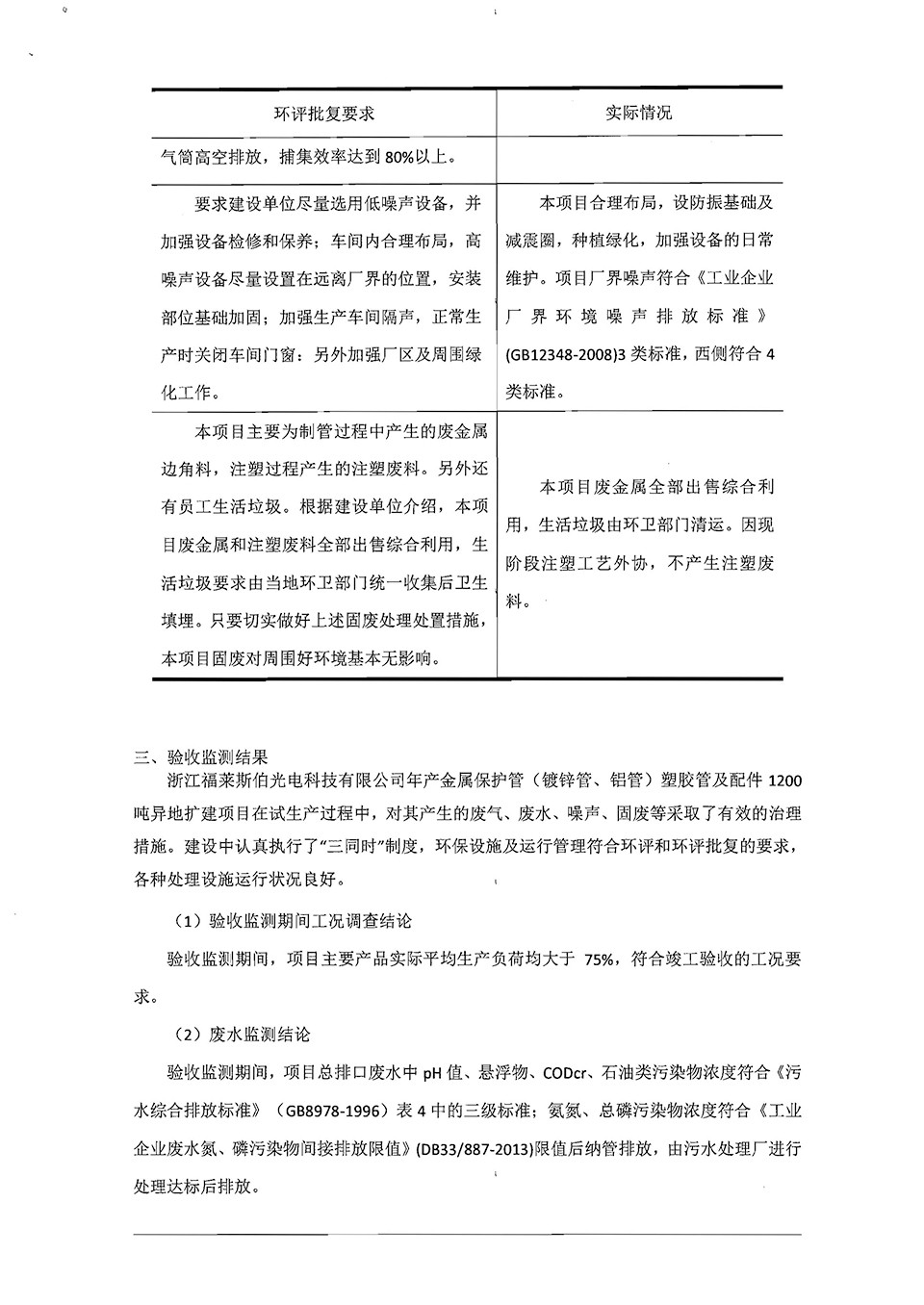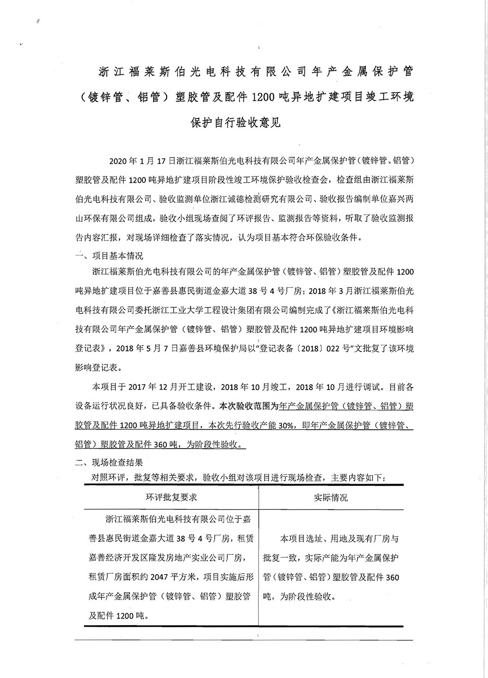 浙江福萊斯伯年產金屬保護管(鍍鋅管,鋁管)塑膠管及配件1200噸異地擴建項目竣工環境保護自行驗收意見